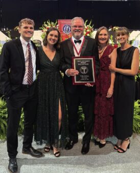 Ted Clem, center, receives his 2025 Sports Hall of Fame plaque from Troy University Chancellor Jack Hawkins Jr. Troy welcomed Ted Clem home this spring with a whirlwind of activity. On April 1, he took the helm as president of the Pike County Economic Development Corp., and at the end of the month, Clem donned a black tie for his induction into the Troy University Sports Hall of Fame.